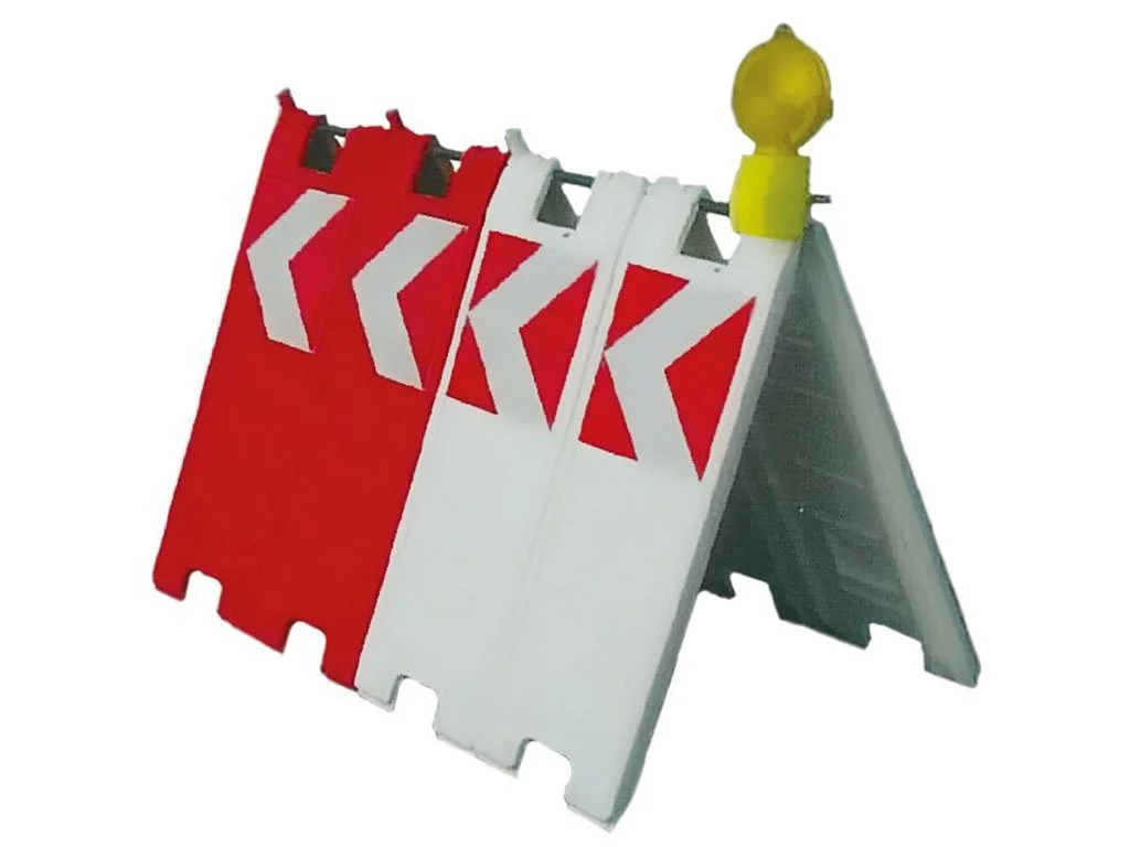 Cavalletto mobile realizzato in PVC appesantibile con acqua (10 kg ca.), dotato di fori per il fissaggio di segnali temporanei.