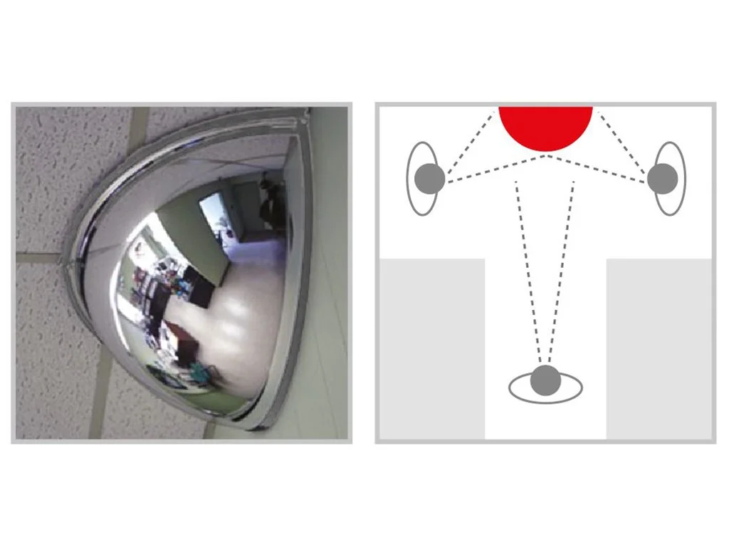 Realizzata in acrilico. La forma la rende ideale per applicazione ad angolo (tra parete e soffitto) ma può essere fissata su qualsiasi superficie piana. Campo visivo di 180°.