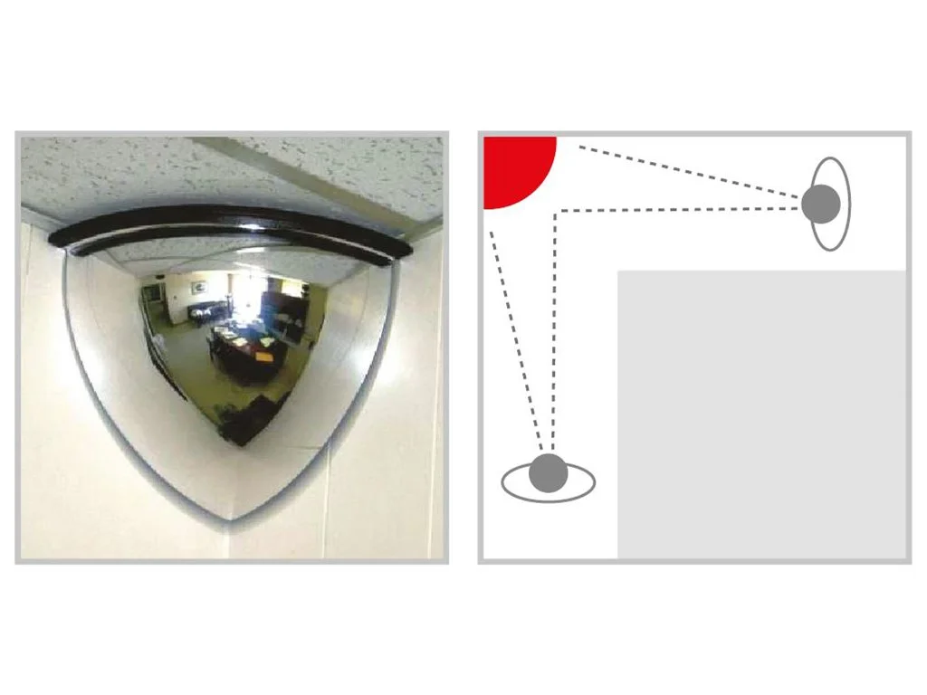 Realizzata in acrilico. La forma la rende ideale per applicazione ad angolo (tra parete e soffitto) ma può essere fissata su qualsiasi superficie piana. Campo visivo di 90°.